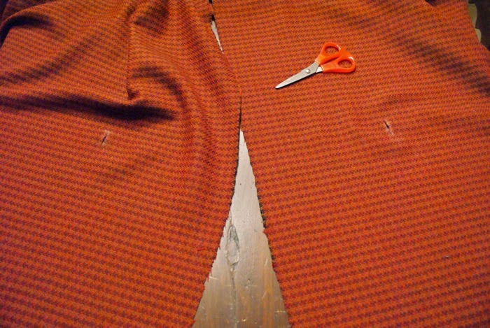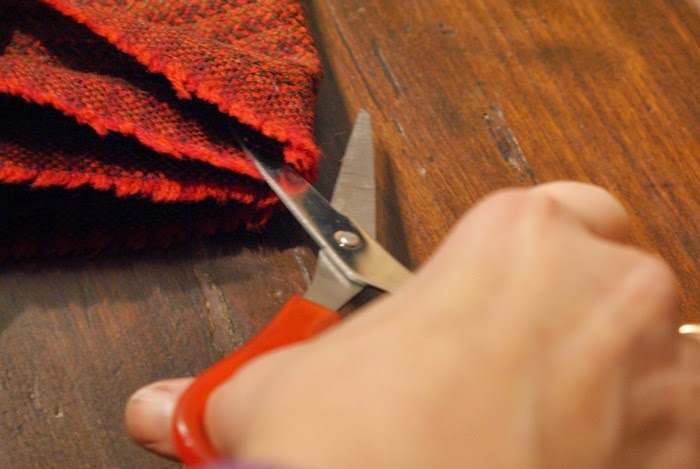 Pinch the fabric and cut it where you signed belt loops. Cut about 3 millimeters more than your belt’s height. To wear this cape, insert the belt in one hole, make it pass around your waist (but under the fabric), then send it out from the other hole. // Prendete il tessuto tra le dita e tagliatelo in prossimità dei segni che avete fatto. Tagliate circa 3 millimetri in più rispetto all’altezza della vostra cintura. Per indossare questo capo, infilate la cintura in un buco, fatela passare intorno alla vostra vita (ma sotto il tessuto), poi fatela uscire dall’altro buco.