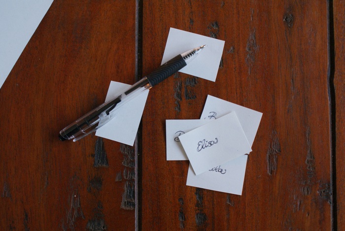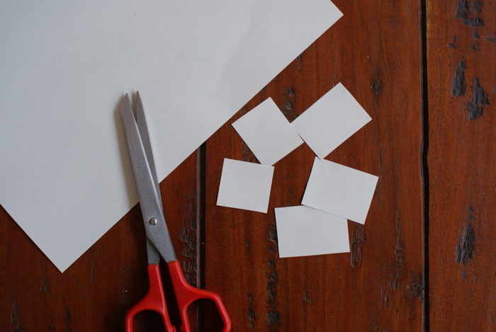 Cut as much little paper rectangles as your guests number. // Tagliate tanti rettangolini di carta quanti sono gli ospiti.