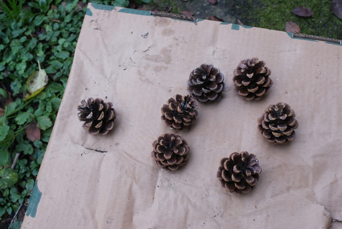 Insert each name in a pine cone (yeah, it sounds weird but you will understand how easy it is while doing it). // Infilate ogni nome in una pigna (sì, suona strano, ma capirete quanto è semplice mentre lo farete).