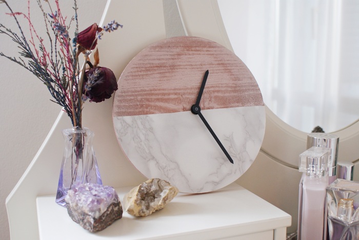 Dopo anni, la mia passione (okay, ossessione) per il marmo è ancora sulla cresta dell’onda, tanto quanto quella per il rame. Inutile dire che stiamo progettando di usare entrambi i materiali nella nuova casa, ma ve ne parlerò più avanti quest’anno. Mi piace qualsiasi cosa sia fatta di marmo/rame e penso che insieme siano praticamente perfetti! Ecco perché ho realizzato questo orologio con meno di…10€. Dall’aspetto costoso e facile (imbarazzantemente facile) da fare, cosa volete di più?