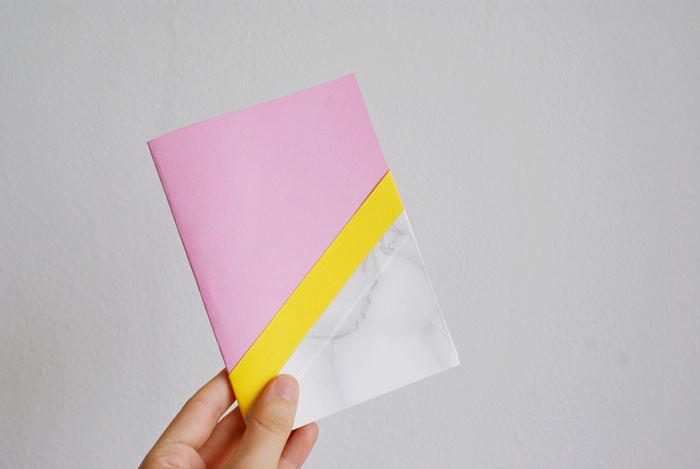 Now make the cover. Cut a piece of cardboard (measure the open sheets sides and add 5 mm for each side) and other decorations you would for your journal. I opted for pink cover, with a piece of yellow cardboard and some marble paper. Glue them together as you prefer and then glue the cover to the sheets. You’re done! // Ora fate la copertina. Tagliate un pezzo di cartoncino (misurate i fogli aperti ed aggiungete 5 mm per ogni lato) ed altre decorazioni per il vostro diario. Io ho optato per copertina rosa, cartoncino giallo e della carta marmorizzata. Incollate il tutto come più vi piace e alla fine incollate i fogli alla copertina e avete fatto!
