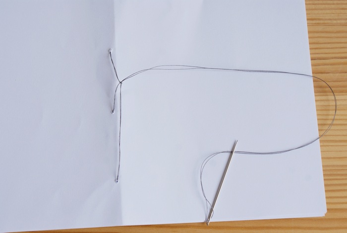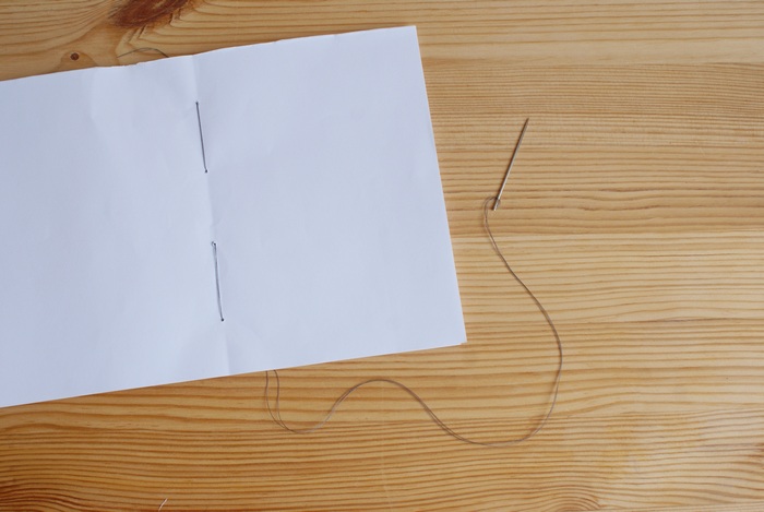 Take needle and thread, make the first knot and sew starting from the back and making the needle pass through the points you made. If you prefer, you can make the holes before you sew the sheets together. // Prendete ago e filo e fate il primo nodo e cucite i fogli partendo dal retro e facendo passare l’ago attraverso i punti segnati. Se preferite, potete fare i buchi prima di cucire.